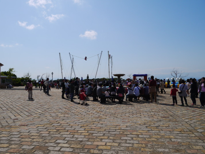 少し奥に進むと広場があって、そこでは大道芸を披露している人、それに逆バンジージャンプのような遊具で遊んでいる子どもがいました。